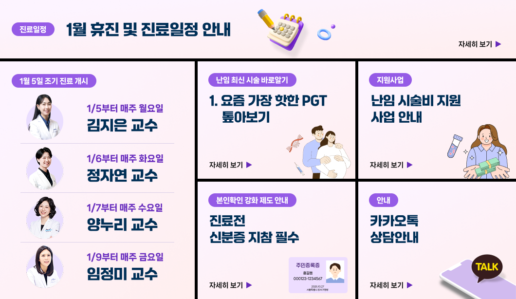 난임 및 시험관 아기 시술, 배란장애, 다낭성난소증후군, 인공수정, 난자냉동, 가임력보존, 자궁경수술, 착상전유전검사(PGT-A,SR)