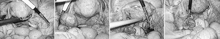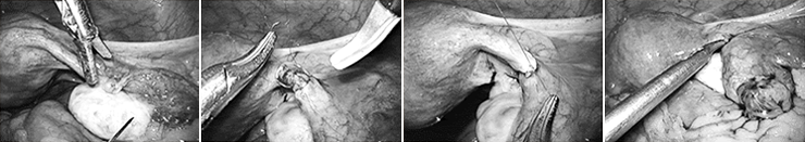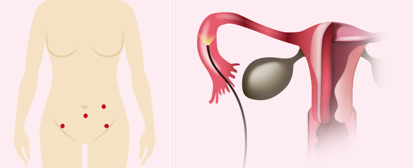 전신마취 하에 특수 바늘을 이용해 복강 내로 이산화탄소 가스를 주입하여 복강 내 공간의 시야를 확보한 후 배꼽 하단에 약 10mm 정도를 절개하여 내시경 카메라를 삽입합니다. 추가적으로 하복부에 5-10mm의 구멍을 통하여 내시경 기구들을 삽입하고 삽입된 내시경카메라와 연결된 모니터를 통해 확대된 영상을 보면서 수술을 시행합니다.