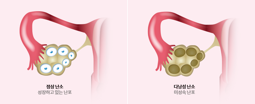 - 남성호르몬은 지방 조직에서 여성호르몬으로 전환되고 이것이 과다하게 되면 시상하부, 뇌하수체, 난소 등에 영향을 미쳐서 배란 장애를 유발합니다. 더구나 과도한 남성 호르몬은 난포발달을 방해하여 무수한 미성숙 난포를 만들게 됩니다.