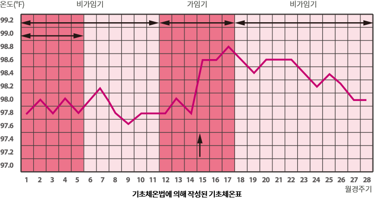 기초체온으로는 배란일을 추정하여 임신 가능한 날짜를 알 수 있으며, 무배란 여부를 확인할 수 있습니다. 체온이 올라간다는 것은 황체호르몬이 순조롭게 분비되고 있다는 증거이며, 이때 자궁내막은 황체 호르몬에 의해 더 한층 풍부하게 점액을 분비하면서 수정란이 착상하기 좋은 환경을 만들게 됩니다. 그러나 착상이 이루어지지 않으면 황체는 2주 정도면 위축되어 버리고 황체호르몬이 감소되면서 자궁내막이 벗겨져 떨어집니다. 이것이 월경혈이며 이 때 체온은 낮아집니다.